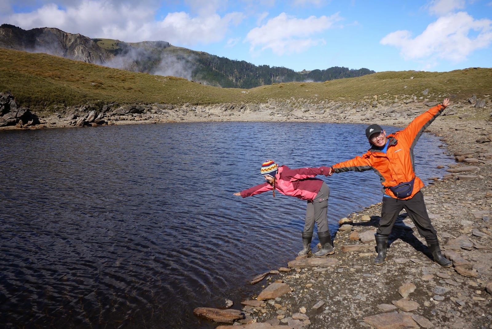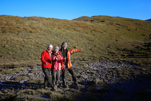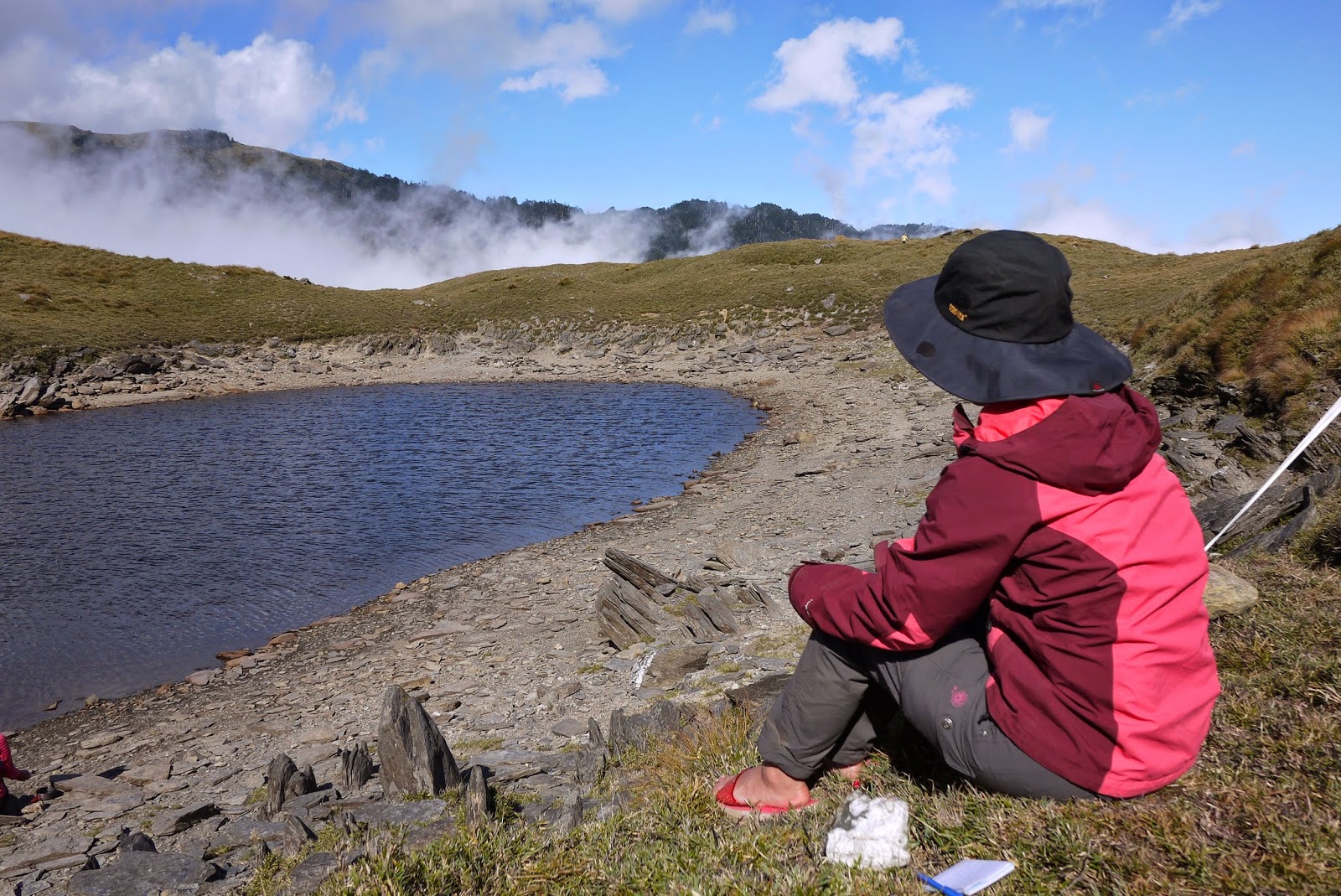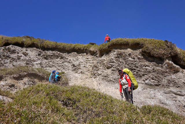原來友隊某隊員出現失溫狀況,嘴唇發白,下山天氣已經好轉高度也下降不少,不是高山反應直接症狀,只要妥善處理就能化險為夷。大媽與幾位嚮導在後面處理,其餘隊員往前推進到合理的水源空地休息。